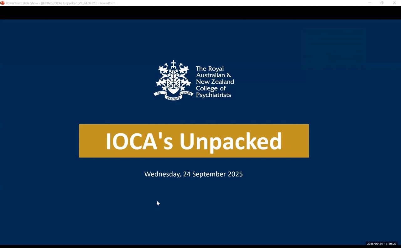 RANZCP EducationThis 2-part session includes updates from Dr Greg Spencer, Chair of the Committee for Training, and Dr Alan Faulkner, Chair New Zealand Training Committee, on the recent changes to the OCA/IOCA rating scale and revised scoring guide, and practical advice from Dr Nick Bendit, Hunter New England Mental Health Psychiatry Training Program (HNET), on conducting detailed clinical interviews and developing a strong formulation.